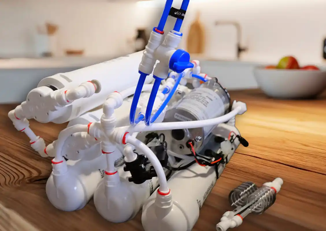 Avant de “faire du fin”, on commence toujours par le gros bon sens : enlever ce qui trouble l’eau (sédiments, particules, dépôts liés aux travaux de réseau) et protéger le cœur du système. Cette étape joue un double rôle : elle stabilise le goût (charbon actif pour le chlore et certains COV) et prolonge la durée de vie de la membrane d’osmose inverse. Résultat : une eau déjà plus agréable et un système qui travaille dans de bonnes conditions — moins de saturation, plus de constance.